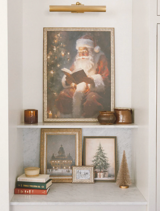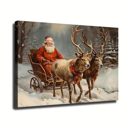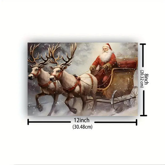 Wooden Framed Canvas Painting Santa Claus & Reindeer Sleigh 8x12"