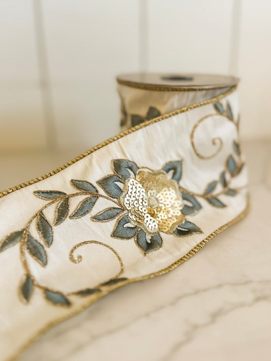 4" White Ribbon with Blue and Gold Floral Detail