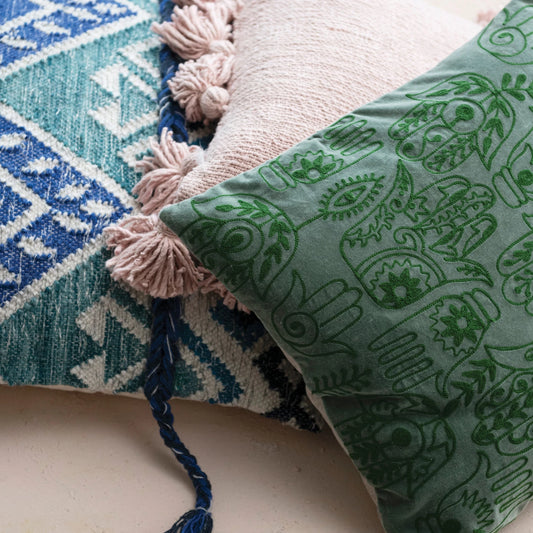 24"L x 16"H Woven Cotton Slub Lumbar Pillow w/ Embroidered Pattern