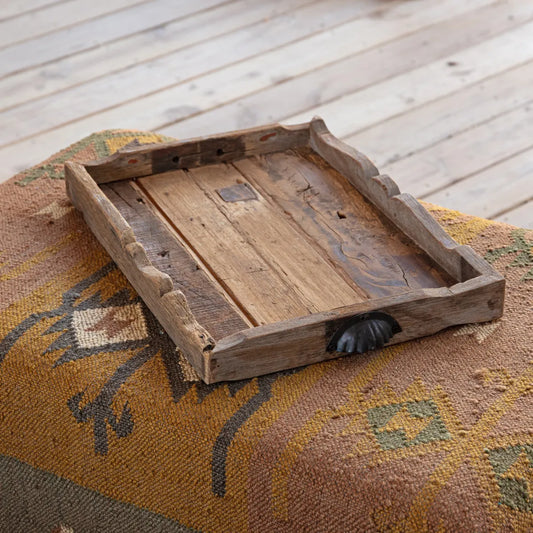 SCALLOPED TRAY OF RUSTIC WOOD WITH IRON HANDLES