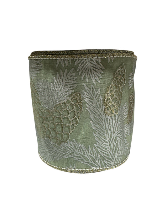 4" Green Wired Ribbon with Gold and Silver Pinecones