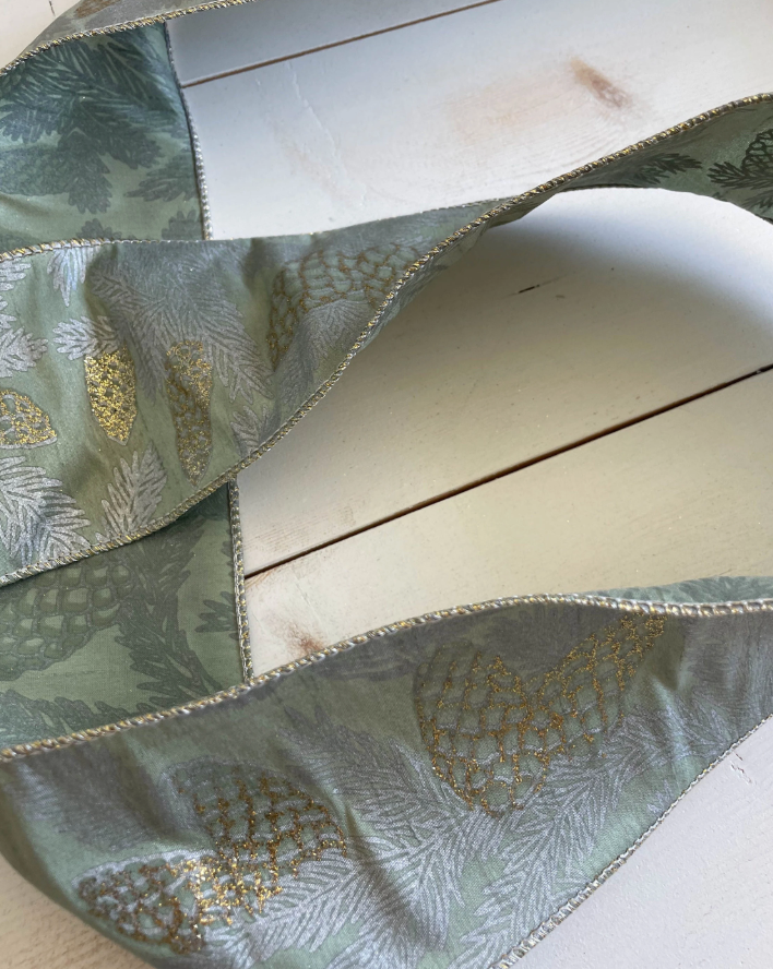 4" Green Wired Ribbon with Gold and Silver Pinecones