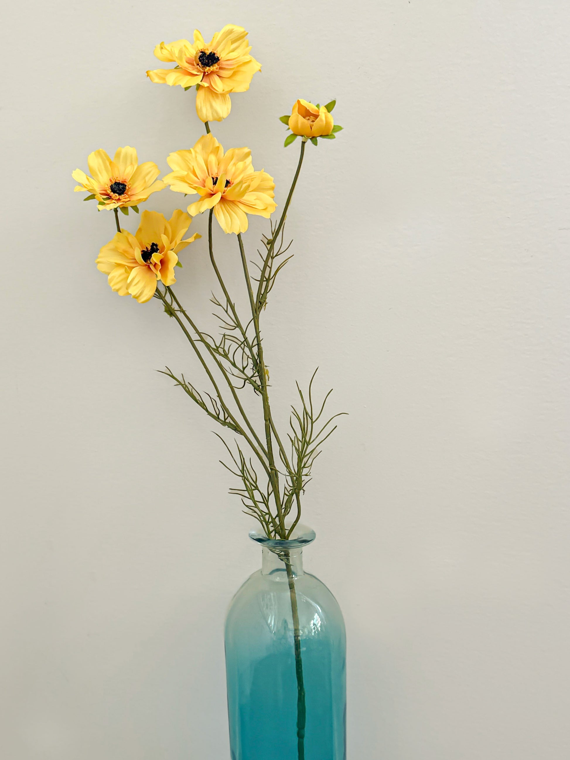 Elevate your space with our 32" Yellow Cosmos Spray, featuring 4 stunning flowers and a bud. These luxurious blooms will add a touch of sophistication and grace to any room. Made with premium materials, this exclusive piece will bring a touch of artistry and beauty to your home.