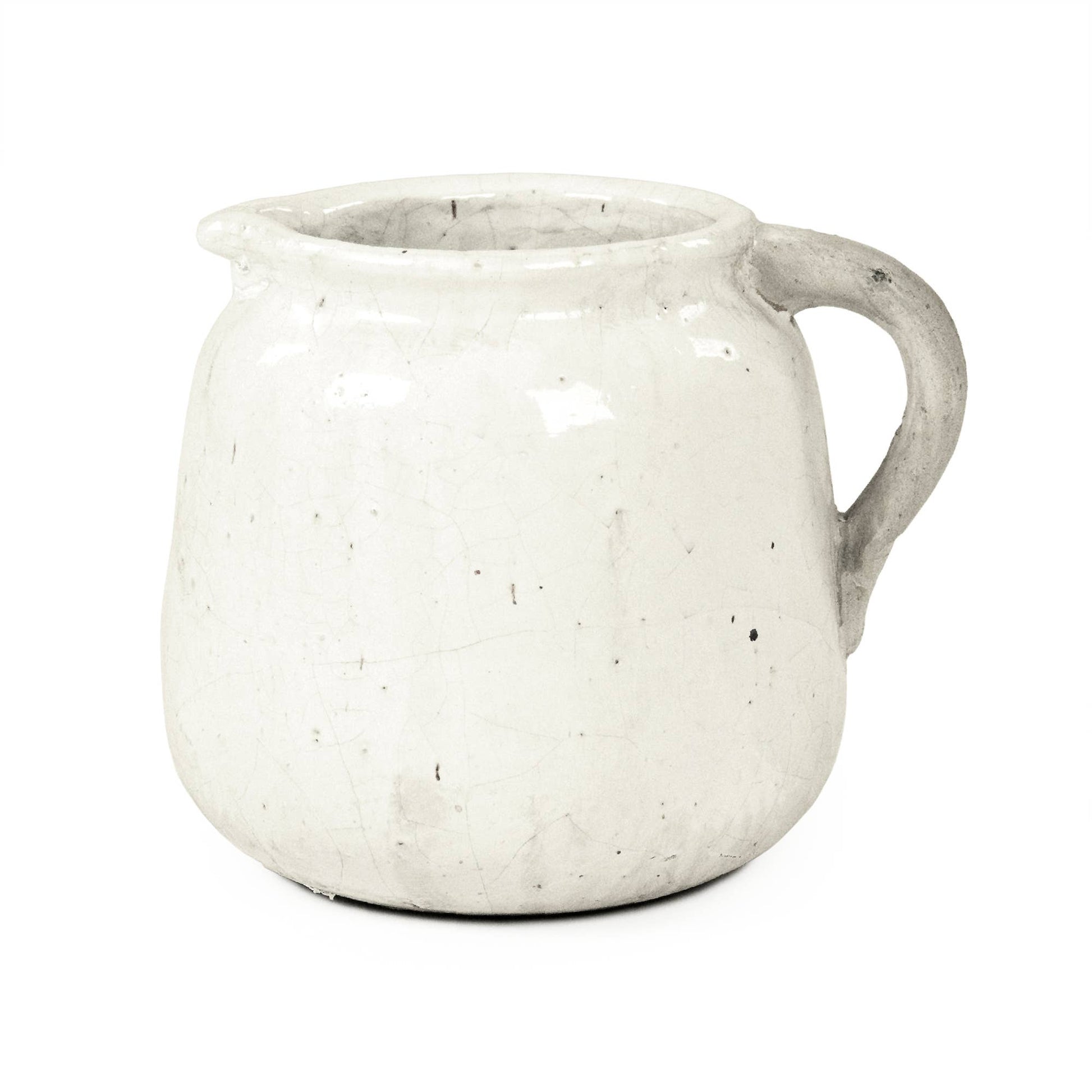 This charming stoneware pitcher brings rustic elegance to any space with its generously sized, rounded silhouette and beautifully distressed white finish. The weathered surface adds authentic vintage character, making it perfect for displaying fresh florals, dried botanicals, or as a standalone decorative accent. Its substantial yet compact proportions make it ideal for both traditional and contemporary interiors seeking that coveted farmhouse aesthetic. Approximately 11"x 8.5" Each pitcher is handmade so there are variations on color and attachment of handles. If you'd like to see a photo of the ones we have in stock reach out to ShopHollyJHome@gmail.com for more images of what we have in stock.