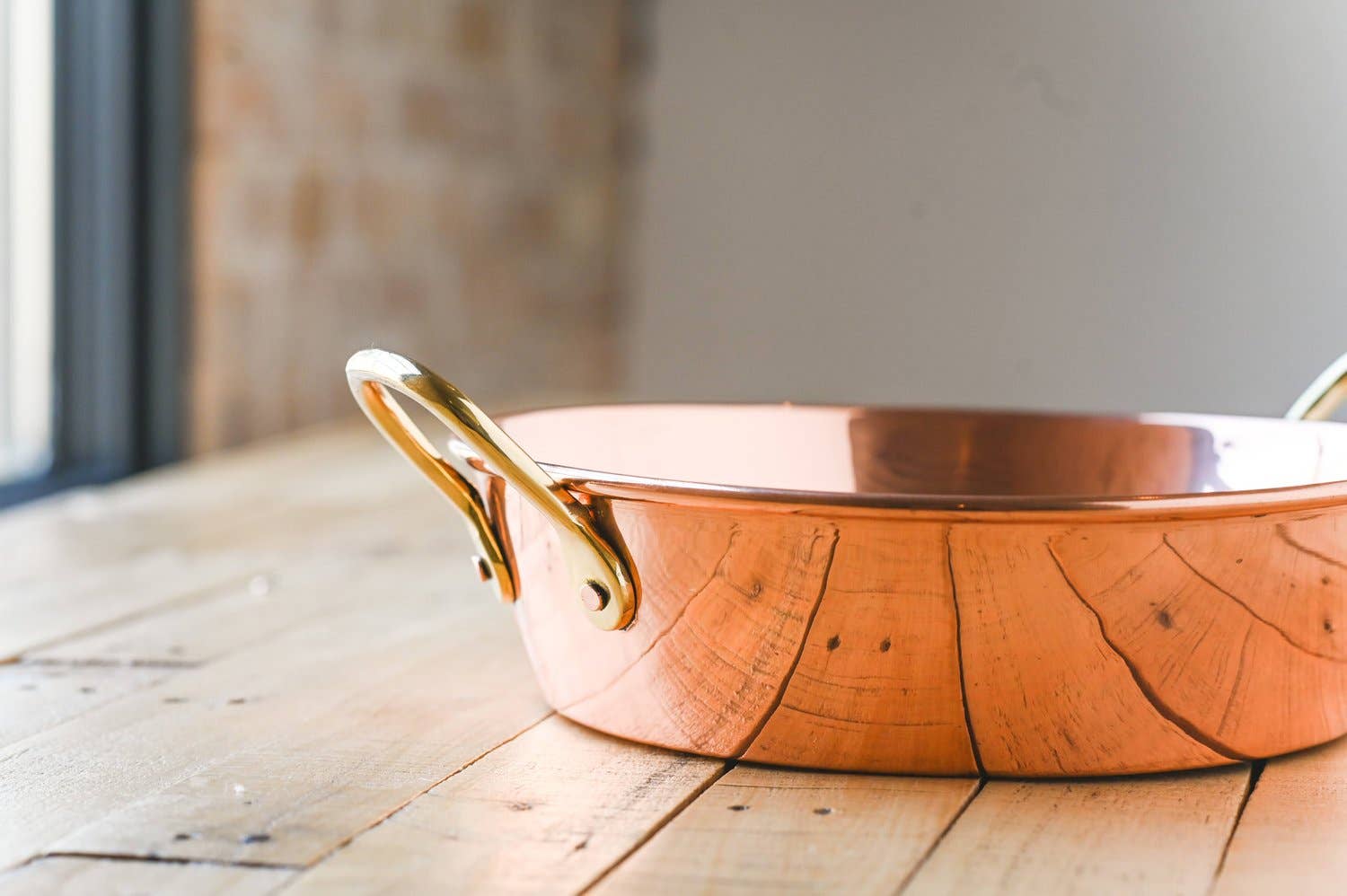 Copper Fait Tout or the "do everything pan". 11" diameter, 3" depth. Made entirely out of copper, featuring two brass handles. If it doesn't belong in a cottage kitchen, it doesn't belong in your kitchen. With that as our model, we designed our Fait Tout Pan. This charming copper pan should be an essential part of your kitchen.