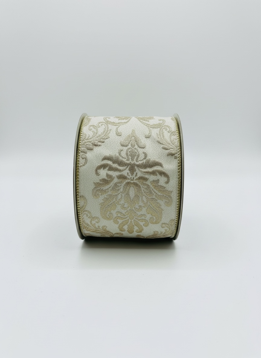 Elevate your holiday decoratig with this refined Gold and Ivory Jacquard Ribbon. Featuring an intricate jacquard weave in soft ivory with subtle greenish undertones, this ribbon pairs beautifully with a light sage green backing for added depth and visual interest. The sophisticated color palette makes it ideal for Christmas and Holiday decorating as well as weddings. Measuring 4 inches wide by 10 yards long, this versatile ribbon brings an elegant finishing touch to any creative endeavor.